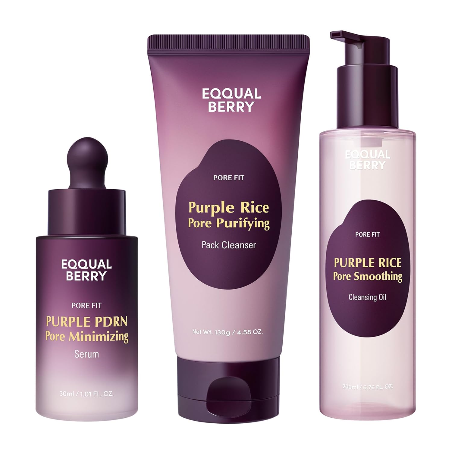 EQQUALBERRY – Purple Rice 3-Step Pore Care & Glass Skin Trio – Gel et huile nettoyante + Sérum visage – Exclusive Kit