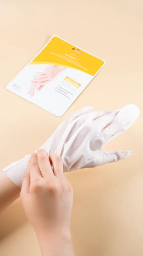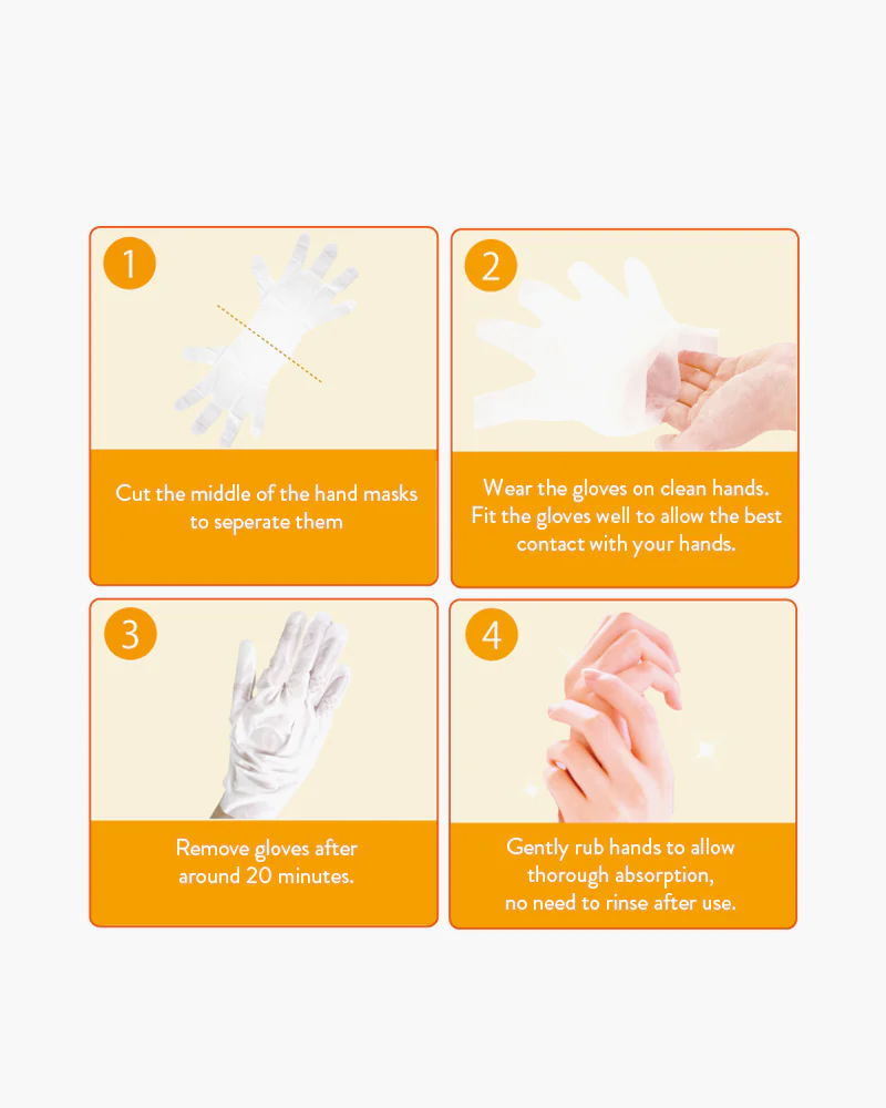 Enfilez les gants sur vos mains propres et sèches, laissez poser 15 à 20 minutes, puis massez l’excédent de crème jusqu’à absorption.