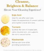 – Ce nettoyant est enrichi en acide kojique, en curcuma et en niacinamide, qui purifient les pores et éliminent les impuretés tout en hydratant la peau pour un teint éclatant et lumineux.